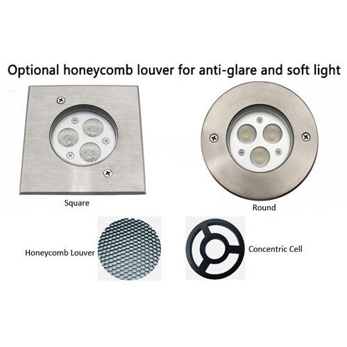 Thép không gỉ 316 bằng thép không gỉ IP67 DC12V DC24V hoặc AC100-240V 3W 6W 9W Đèn LED âm trần chiếu sáng LED ánh sáng điểm dưới lòng đất Đèn LED quảng trường Đèn LED đi bộ Đèn LED bước với thấu kính không đối xứng, kính khuếch tán, cánh đảo gió tổ ong, ô đồng tâm tùy chọn.
