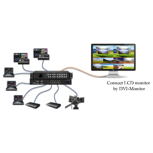 - Được kết nối với màn hình thông qua cổng đầu ra DVI-Monitor, bạn có thể xem trước tất cả các tín hiệu đầu vào và theo dõi màn hình tín hiệu đầu ra cùng một lúc.