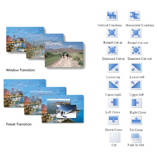 - Hỗ trợ nhiều hiệu ứng đặc biệt khi chuyển đổi các tín hiệu khác nhau, bao gồm mờ dần, lên và xuống, trái và phải, chéo lên và chéo xuống, hình cắt hình tròn, hình cắt hình kim cương..