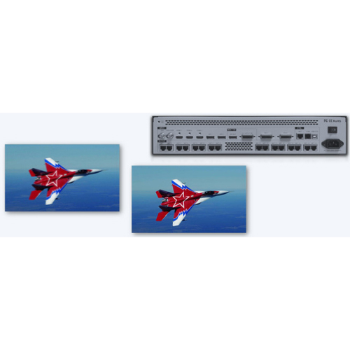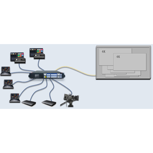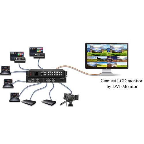 - Hoàn thành giám sát đầu vào và đầu ra trên một màn hình • Được kết nối với màn hình thông qua cổng đầu ra DVI-Monitor, bạn có thể xem trước tất cả các tín hiệu đầu vào và theo dõi màn hình tín hiệu đầu ra cùng một lúc.