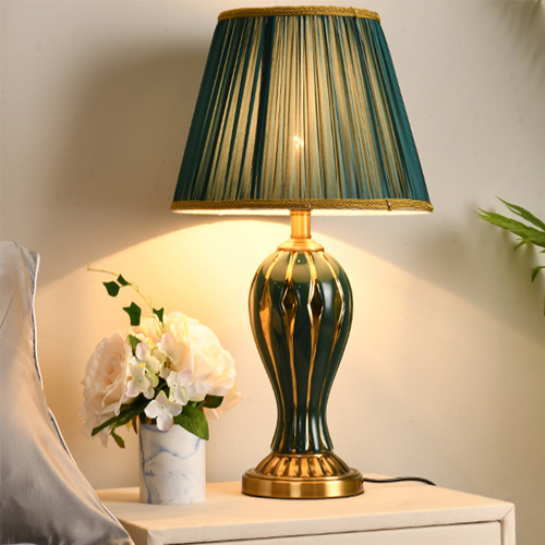 Chất Liệu : Thân Gốm, Chao Lụa, đế hợp kim mạ đồng, điều khiển chiết áp