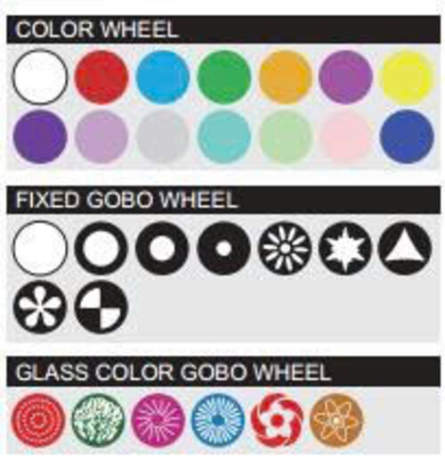 ĐẶC ĐIỂM CHÍNH Bánh xe màu cố định với 13 màu: Trắng 1 bánh xe gobo cố định với 8 gobo cố định + 6 gobo màu thủy tinh (Mở)
