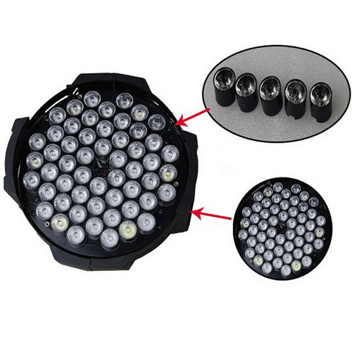 Bóng đèn: PAR LED 54x3W-RGBW Sử dụng bóng LED siêu sáng công nghệ mới nhất. Công suất chuẩn 3W với 54 bóng: Đỏ – 12 bóng, Xanh lá – 18 bóng, Xanh dương – 18 bóng, Trắng – 6 bóng. Các bóng đèn tiêu thụ ít điện năng, độ sáng cao, hiệu suất ổn định, độ bền cao.
