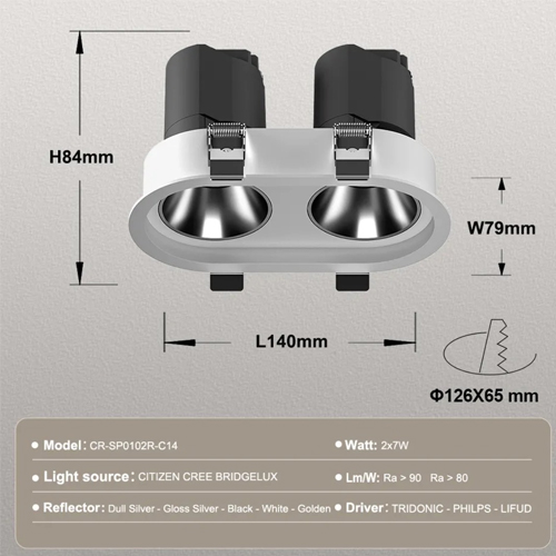 Đèn downlight đôi hình bầu dục 14W được làm bằng tản nhiệt nhôm nguyên chất giúp tản nhiệt tốt hơn. Nhiệt độ Tc khoảng 65-70 độ ở trạng thái ổn định giúp đèn này có hiệu suất ánh sáng cao hơn và tuổi thọ cao hơn. Độ phân rã ánh sáng phải nhỏ hơn 21% sau 5 năm làm việc. Nó được kết hợp chủ yếu bởi các tấm phản xạ màu khác nhau, chip COB thương hiệu, Ống kính acrylic. Giống như hầu hết đèn led chiếu điểm, nó có cấu trúc giao diện chống chói, với UGR nhỏ hơn 16. Sau khi đèn chiếu sáng này chìm xuống trần nhà, ánh sáng sẽ phát ra mà không bị chói. Loại đèn chiếu sáng này chủ yếu được sử dụng trong các khách sạn sang trọng, biệt thự cá nhân, trung tâm mua sắm, nơi bắt buộc phải có cấu trúc chống chói, đồng thời yêu cầu thông lượng lumen cao hơn.