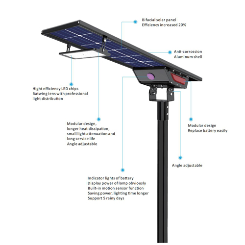 Đèn đường led năng lượng mặt trời tích hợp Bifacial sử dụng bảng điều khiển năng lượng mặt trời đơn sắc hiệu suất cao, bộ điều khiển sạc MPPT thông minh, pin LifePO4 có tuổi thọ cao, chip led 3030 lumen cao tất cả trong một hộp, dễ lắp đặt và vận chuyển.