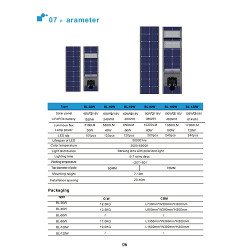 Thông số kỹ thuật của đèn đường LED năng lượng mặt trời tích hợp Bifacial :