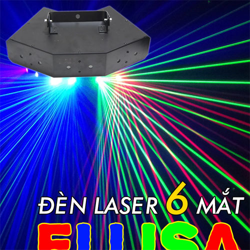 Đèn laser 6 mắt elisa là một dòng sản phẩm đèn laser sân khấu mới nhất . Đèn laser elisa có thiết kế hình cánh cung rất khác lạ so với các dòng đèn laser thông thường, 6 mắt laser được bố trí đều theo 3 phía khác nhau khi chiếu sáng sẽ cho ra chùm laser quét rộng khắp một không gian có diện tích từ 25 tới 30 mét vuông. Đèn laser elisa 6 mắt có 3 màu, màu xanh lá cây, xanh dương và cuối cùng là màu đỏ. Đèn có các chế độ chạy sau: tự động, cảm ứng âm thanh, qua thiết bị điều khiển. Đèn laser elisa rất phù hợp dành cho phòng hát, quán bar, vũ trường….