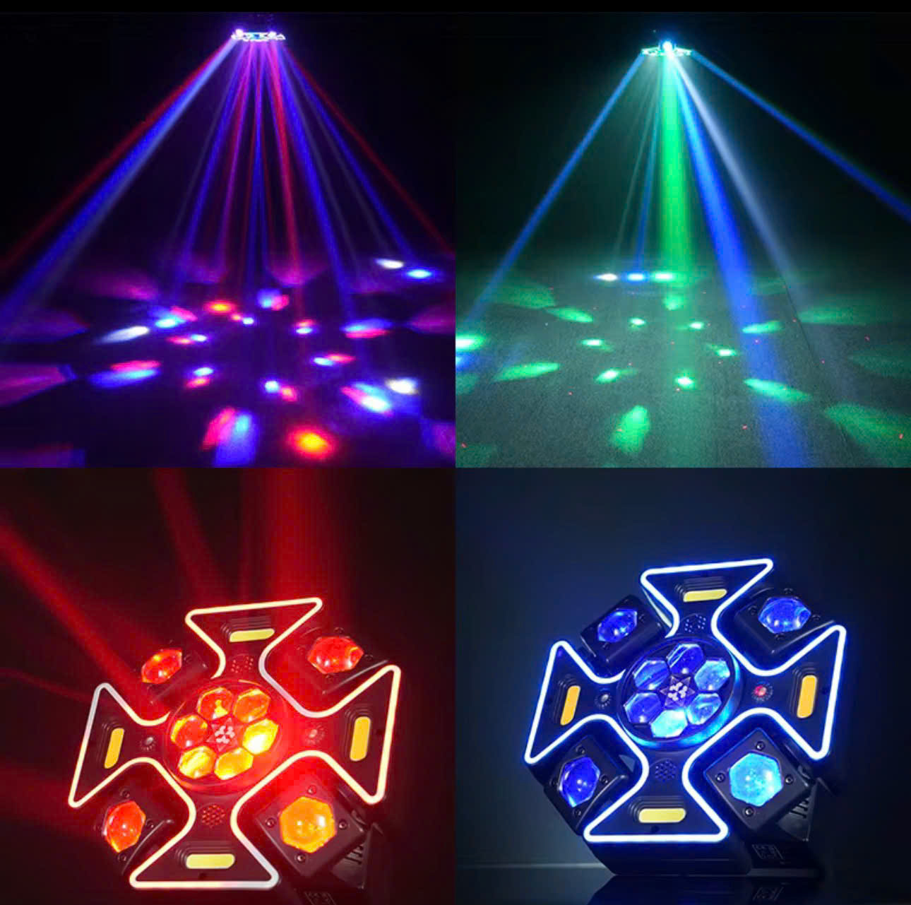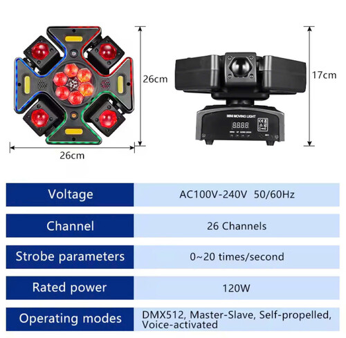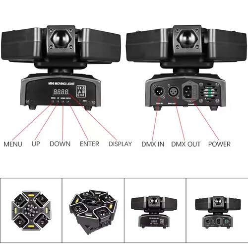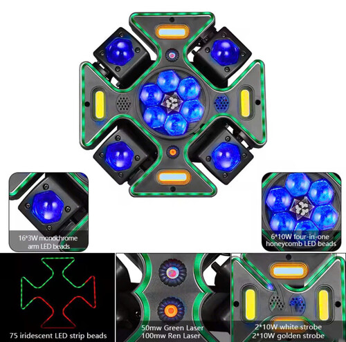 Nguồn sáng: LED, Laser, Chớp Điều khiển: DMX512 (15 kênh), remote, master/slave, âm thanh