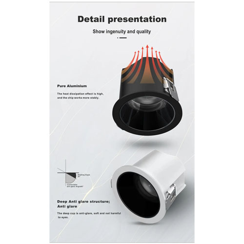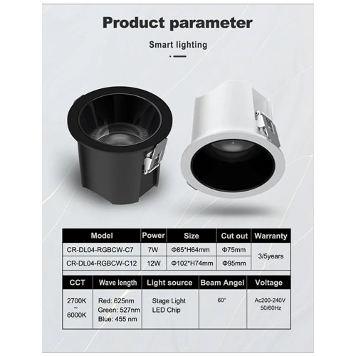 Đèn LED Downlight 7W RGBCW là loại sản phẩm chiếu sáng thông minh. Với ba màu sáng cơ bản Đỏ Xanh Xanh và cũng có thể lựa chọn nhiệt độ màu 2700K-6000K. Màu sắc ánh sáng có thể được điều chỉnh theo các mức độ khác nhau, như thời gian chơi, nghe nhạc. Thân đèn được làm bằng nhôm nguyên chất giúp tản nhiệt tốt hơn. Nhiệt độ Tc ở trạng thái ổn định khoảng 65-70 độ, giúp đèn này có hiệu suất ánh sáng cao hơn và tuổi thọ dài hơn. Độ phân rã ánh sáng phải nhỏ hơn 21% sau 5 năm làm việc. Giao diện ánh sáng nằm sâu bên trong nên có tác dụng chống chói. Sau khi đèn chiếu sáng chìm vào trần nhà này, ánh sáng sẽ phát ra mà không bị chói. Loại đèn chiếu sáng này chủ yếu được sử dụng trong các khách sạn sang trọng, quán bar, câu lạc bộ, không gian KTV, biệt thự cá nhân, trung tâm mua sắm, nơi bắt buộc phải có cấu trúc chống chói, đồng thời yêu cầu thông lượng lumen cao hơn.