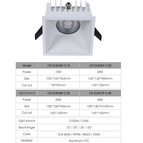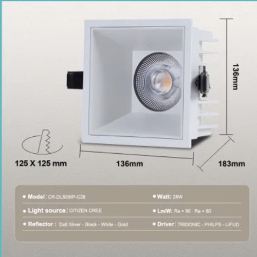 Đèn led âm trần vuông này được làm bằng tản nhiệt hợp kim nhôm loại ADC12 giúp tản nhiệt tốt hơn.Nhiệt độ Tc khoảng 65-70 độ ở trạng thái ổn định, giúp đèn này có hiệu suất ánh sáng cao hơn và tuổi thọ dài hơn.Độ phân rã ánh sáng nên ít hơn hơn 21% sau 5 năm làm việc.Độ duy trì Lumen phải trên 79%.Nó được kết hợp chủ yếu bởi các gương phản chiếu màu khác nhau, chip COB thương hiệu, Thấu kính acrylic.Không giống như đèn downlight lõi ngô có độ sáng cao thông thường, nó có cấu trúc giao diện chống chói sâu, với UGR nhỏ hơn 19. Sau khi đèn Downlight COB gắn chìm trên trần nhà này, ánh sáng sẽ phát ra mà không bị chói.Đèn downlight ugr này được sử dụng chủ yếu trong các khách sạn sang trọng, biệt thự cá nhân, trung tâm mua sắm, nơi bắt buộc phải có cấu trúc chống chói, thông lượng lumen cũng cao hơn lời yêu cầu.