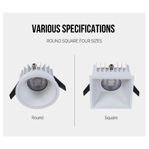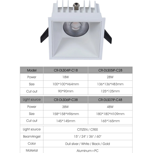 Đèn downlight led vuông này được làm bằng tản nhiệt hợp kim nhôm loại ADC12 để tản nhiệt tốt hơn. Nhiệt độ Tc khoảng 65-70 độ ở trạng thái ổn định, cho phép đèn này có hiệu suất ánh sáng cao hơn và tuổi thọ cao hơn. Phân rã ánh sáng nên dưới 21% sau 5 năm làm việc. Lumen còn lại phải trên 79%. Nó được kết hợp chủ yếu bởi, phản xạ màu khác nhau, chip COB thương hiệu, Ống kính acrylic. Không giống như đèn downlight lõi ngô độ sáng cao thông thường, nó có cấu trúc giao diện chống chói sâu, với UGR nhỏ hơn 19. Sau khi COB Downlight này lõm xuống trần nhà, ánh sáng sẽ tắt mà không chói mắt. Loại đèn downlight ugr này được sử dụng chủ yếu ở các khách sạn sang trọng, biệt thự cá nhân, trung tâm mua sắm, nơi cấu trúc chống chói là điều bắt buộc, yêu cầu thông lượng lumen cũng cao hơn.
