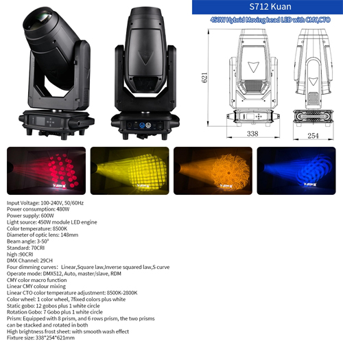 S712 là đèn đầu di chuyển máy tính 3 trong 1, có một động cơ đèn LED 450W tích hợp chùm tia, hoa văn và màu sắc trong một đơn vị. Nó tiết kiệm năng lượng, có tuổi thọ kéo dài, tản nhiệt nhanh, chức năng mạnh mẽ và dễ điều khiển.
