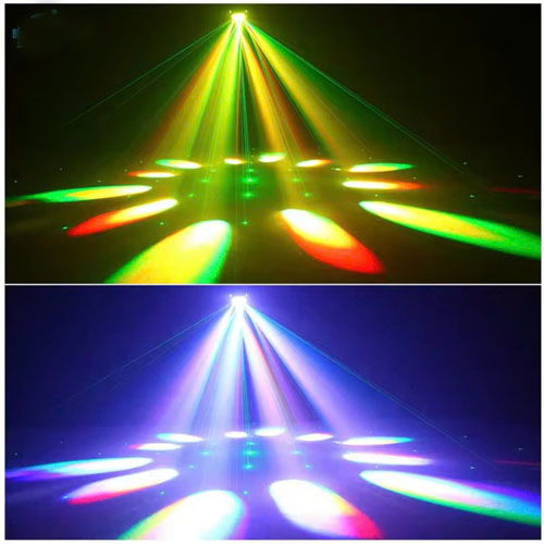 Tên: 6 tia laser RGBW Bee Eyes Điện áp: AC95V-245V/50Hz Công suất sản phẩm: 90W (Bee's Eye 72W, Laser xanh 50MW)