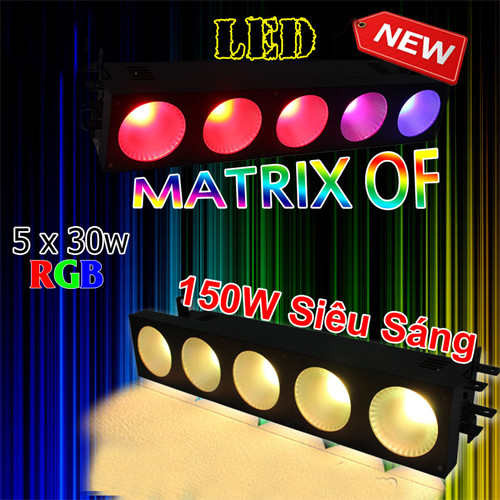 Đèn pha sân khấu LED matrix 150 OF sử dụng 5 bóng LED, mỗi bóng LED công suất 30W RGB siêu sáng. Kết hợp hiệu ứng chase độc đáo, có thể điều khiển từng bóng LED độc lập. Trọng lượng: 4 kg. Kích thước: 62*15*16cm