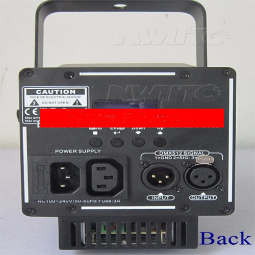Phần dưới khá đơn giản chỉ với một quạt làm mát, công tắc ON/OFF, bảng điều khiển LED cùng 4 phím bấm vật lý MENU, UP, DOWN, ENTER giúp bạn điều khiển đèn Profile với các hiệu ứng Follow theo đối tượng chủ thể trong sân khấu, nhà hát một cách dễ dàng nhất.