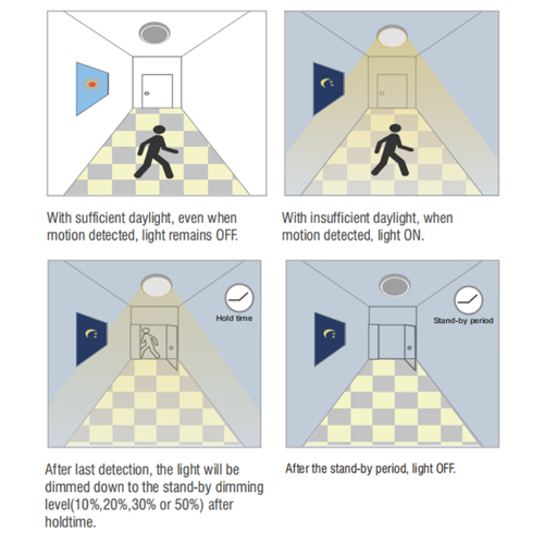 4. Cảm ứng vi sóng nhúng, cảm ứng lắp đặt trần Góc 360 độ, khoảng cách cảm ứng 10 mét;