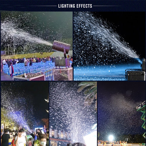 Thân máy được làm bằng thép không gỉ siêu bền, chống ăn mòn và bền bỉ. Máy có chức năng dao động 120°/360°. Công suất thiết bị là 3000W, với công suất tạo tuyết cực lớn. Khoảng cách phủ tuyết tối đa khoảng 10 mét. Hỗ trợ điều khiển bằng tay và chức năng điều khiển từ xa không dây, vận hành trơn tru và đáng tin cậy, hiệu ứng tuyết rơi mạnh mẽ giúp tăng cường hiệu ứng thị giác, rất phù hợp cho nhiều mục đích khác nhau như biểu diễn sân khấu lớn, biểu diễn sân khấu, các dự án văn hóa và du lịch, v.v.