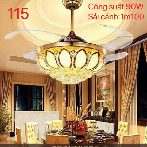 Quạt trần đèn 115 là sự kết hợp giữ đèn và quạt trần rất tiện lợi mang lợi sự sang trọng và tính thẩm mỹ cao cho phòng khách nhà bạn. Điều tiện lợi ở đây là khi chúng ta không dùng quạt cánh quạt sẽ tự động đóng cụp lại khi dùng cánh quạt sẽ tự động mở ra. Công suất 90W rất nhẹ điện tiết kiệm đáng kể điện năng của gia đình chúng ta.