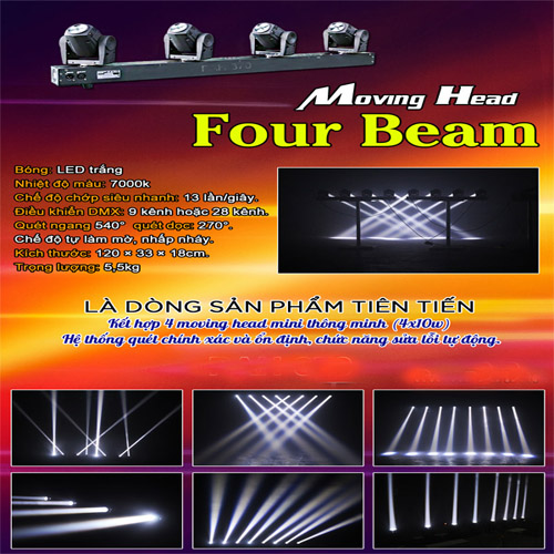 Thanh đèn moving 4 đầu là một dòng đèn moving head sân khấu. Thanh đèn moving 4 đầu với 4 đầu moving mini cử động linh hoạt xoay ngang 540 độ, xoay dọc 270 độ. Khi chạy đèn sẽ tạo ra 4 chùm sáng đổi màu đan xen nhau giúp cho không gian thêm phần sôi động.