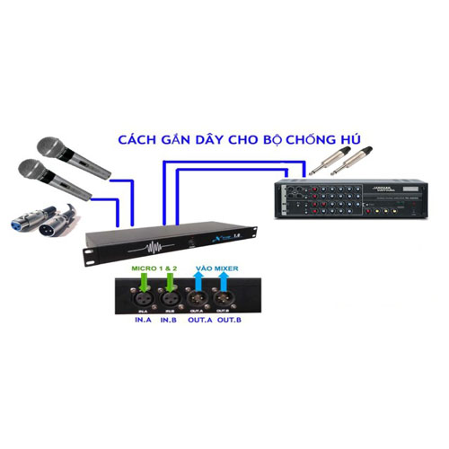 Thứ tự kết nối thiết bị trong dàn âm thanh như sau: Micro gắn dây vào thiết bị chống hú, từ chống hú gắn dây vào Mixer.